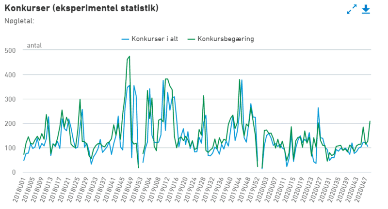Den næste figur viser antallet af konkurser og konkursbegæringer. Hvis corona er et angreb på små og mellemstore private virksomheder, så er dette et godt mål for succesen.