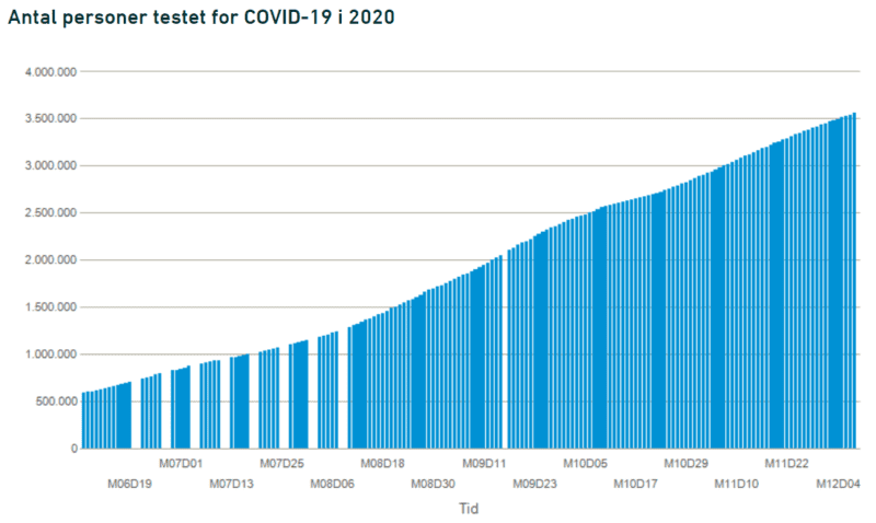 Den første viser antallet af personer, der er blevet testet for CoVid-19 i 2020 over tid. Da det samlede antal testede personer er steget stødt over tid, så er det ikke så underligt, at det samlede antal smittede personer også er steget.