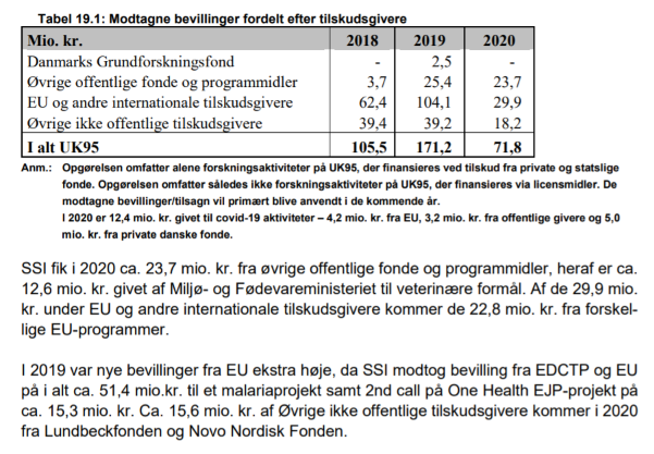 Der står også, at Statens Serum Institut i 2020 modtog 12,4 mio kr til covid-19-aktiviteter: 4,2 mio. kr. fra EU, 3,2 mio. kr. fra offentlige givere og 5,0 mio. kr. fra private danske fonde. Det betyder, at de private fonde, som jo så må være Lundbeckfonden og Novo Nordisk Fonden, er den af de tre finansielle parter til SSI’s covid-19-aktiviteter, der har bevilget flest penge og således må forventes at have størst indflydelse.