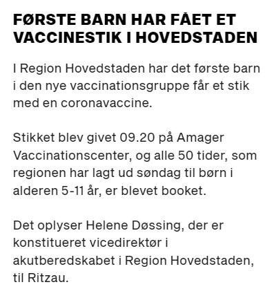 På B.T. kan vi også læse, at det første barn i Region Hovedstaden nu har fået et stik coronavaccine: