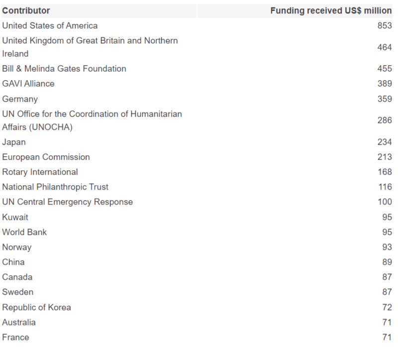 På siden ‘Top 20 contributors to the WHO for the 2018/2019 biennium‘ skriver WHO selv, hvem der har spyttet mest i kassen året inden covid-19 startede.