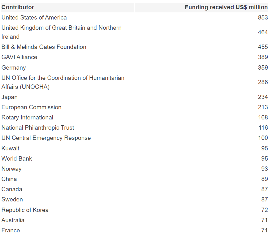 På siden ‘Top 20 contributors to the WHO for the 2018/2019 biennium‘ skriver WHO selv, hvem der har spyttet mest i kassen året inden covid-19 startede.