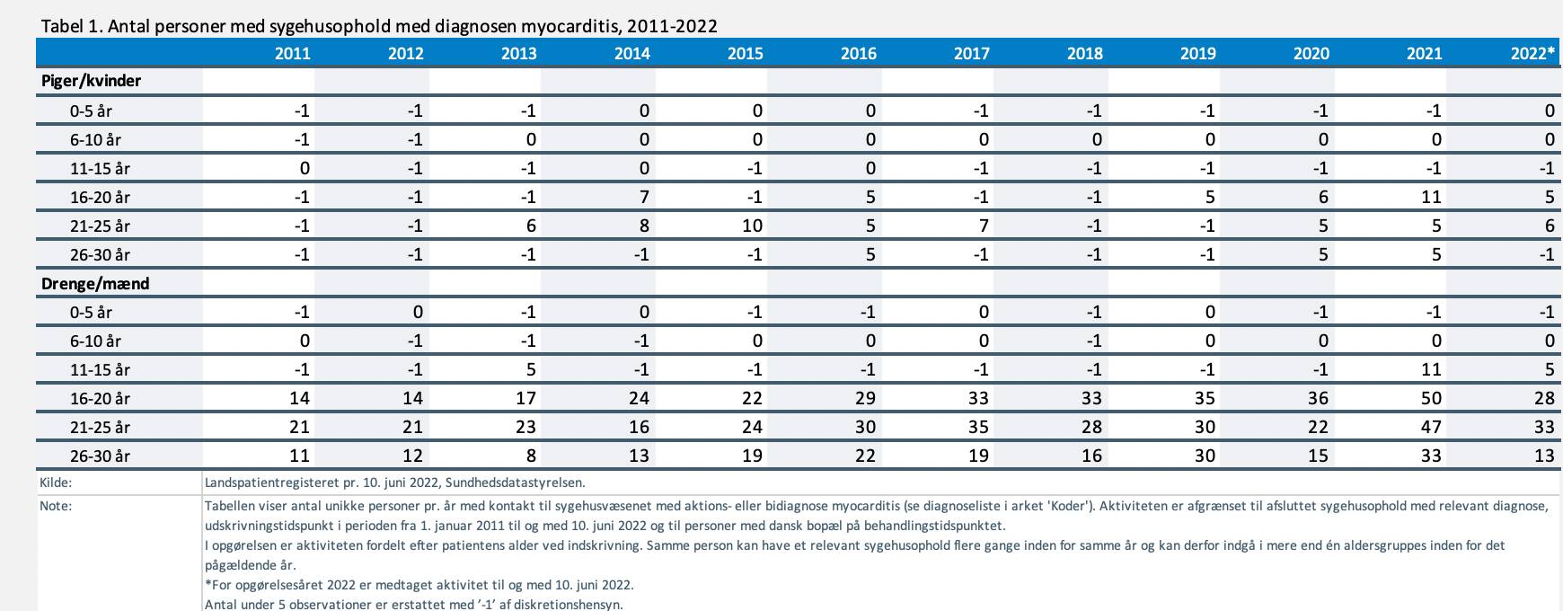 “Apropos elitesport – og undskyld jeg ikke er iklædt gul nissehue på Rådhuspladsen. Myocarditis hos især unge, sportsaktive mænd i forbindelse med corona-injektioner er velbeskrevet i den videnskabelige litteratur. Sammenhængen er IKKE til diskussion længere. Det ses også i forbindelse med corona – hvor det dog primært rammer ældre. Jeg har fået disse tal fra en aktindsigt via Per Brændgaard. De tal du særligt skal bide mærke i er antallet af drenge over 11 år og tallene for især 2021 – hvor en stor del fik op til flere corona-injektioner. Det er en meget stor og bekymrende stigning taget i betragtning at myocarditis er meget sjældent hos børn og unge. Uhyre sjældent faktisk. Hvad er der at sige til det? Jo, at det er en meget alvorlig og urimelig bivirkning hos unge, sportsaktive mænd hvor corona ville overståes i løbet af få dage – måske endda helt uden symptomer. “Kuren” må aldrig være værre end sygdommen. Der er ikke noget som hedder en “mild” hjertebetændelse. Pludselig død kan være en konsekvens – som vi så hos Christian Eriksen som fik hjertestop. Men selv om den unge mand kommer sig hurtigt igen, hvad opgørelserne tyder på, så har hjertet taget skade. Og på sigt risikerer han/hun at udvikle hjertesvigt i en tidlig alder og dermed tidligere død end forventet. Så hjertebetændelse er MEGET alvorligt! Mon ikke det snart er på tide – at vi som de oplyste sportsfreaks vi er – begynder at tage data alvorligt. Når en hel befolkning kan sidde og nedstirre tidsforskelle på brøkdele af sekunder ved Tour de France – så bør det også være muligt at forholde sig til en hel del andre faktuelle oplysninger. Og for pressen at dele (og forstå) disse! Tillykke til Vingegaard – well done! PS. For lidt over et år siden klagede cykelrytteren Jakob Fuglsang over elendig form til Touren og gav hans nylige corona-injektioner skylden.”