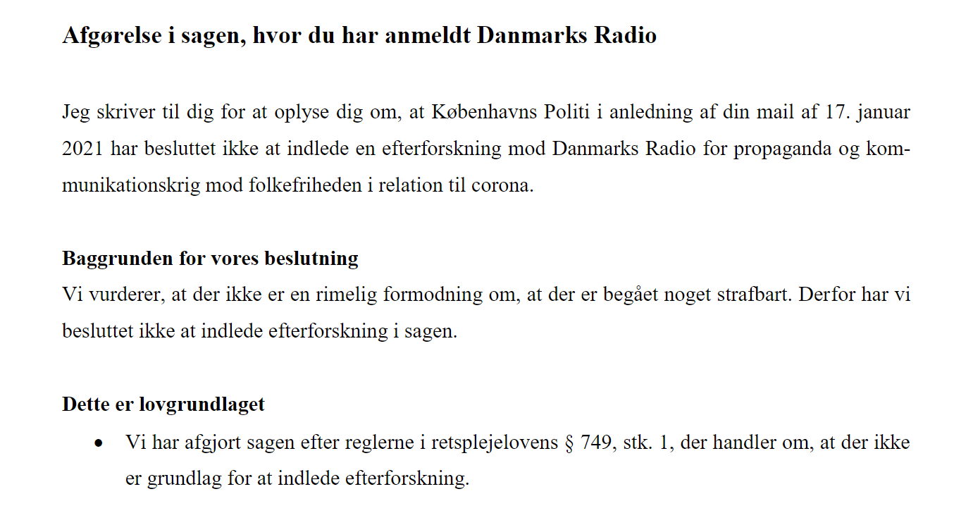 Kategorier Komplet Offentlig PBdk Politik Politik (gratis) Politiet vil ikke efterforske DR Indlægsforfatter Af Peer Brændgaard Indlægsdato onsdag, 15 februar 2023, 15:55 1 kommentar til Politiet vil ikke efterforske DR Jeg modtog i går et brev fra politiet med svar på min anmeldelse af DR. Her er politiets afgørelse: Det har så “kun” taget politiet godt et år at finde ud af, at de ikke vil finde ud af noget. Cover: Unsplash.com (Stefano Pollio) Del: Click to share on Facebook (Opens in new window) Facebook Click to email a link to a friend (Opens in new window) Email Click to print (Opens in new window) Print Tags corona, frihed, kommunikation, kriminalitet ← B.A. #92: Pressen beskylder Nye Borgerlige for at være konspirationsteoretikere → Video: Fokus på WHO-pandemitraktaten 0 0 stemmer Brugervurdering Log ind Log venligst ind for at kommentere 1 Kommentar nyeste ældste flest stemmer Inline Feedbacks Se alle kommentarer Se kommentarer Indlæs flere kommentarer