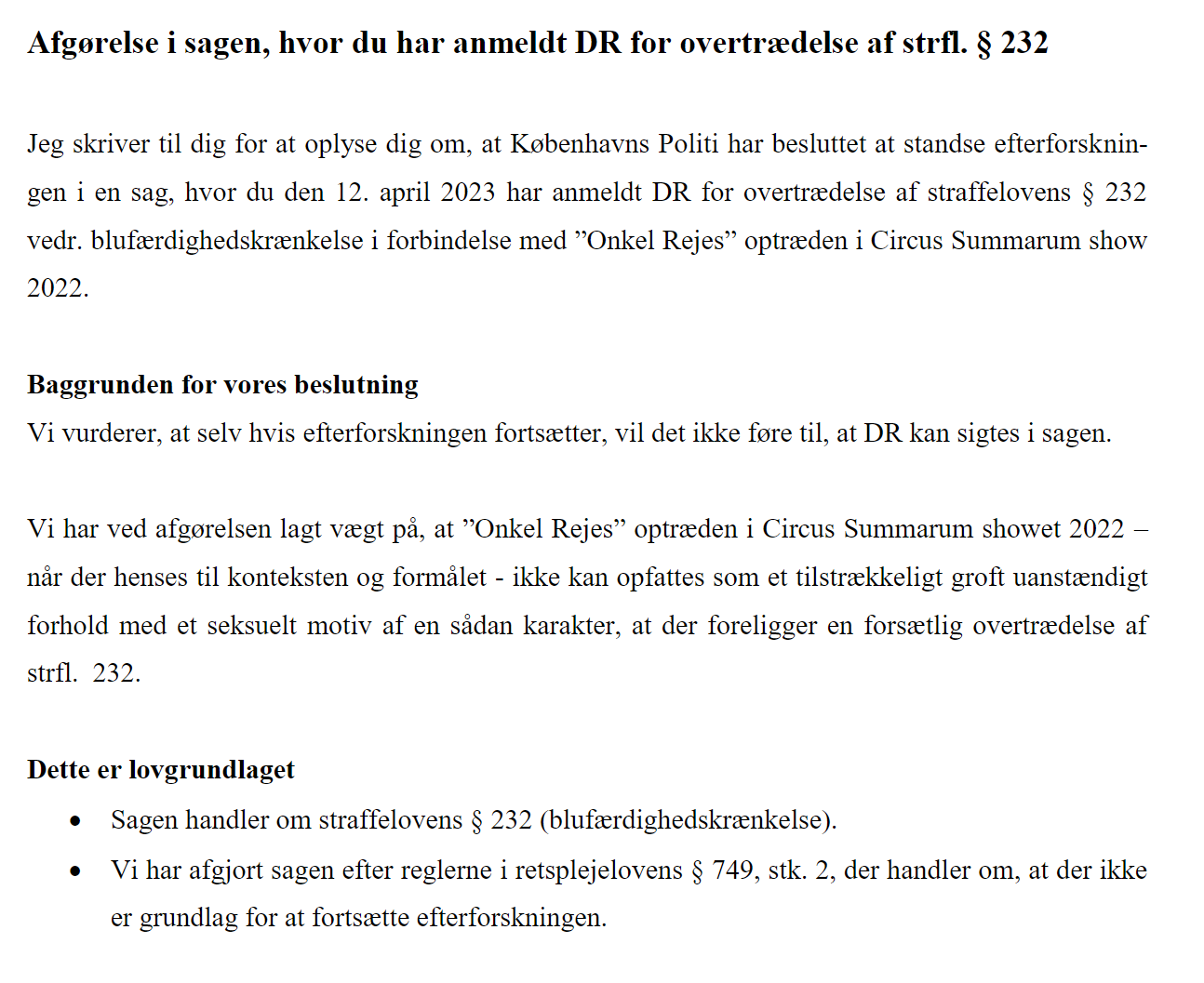 Jeg har i dag fået afgørelse fra Københavns Politi på min anmeldelse af DR for grooming med Onkel Reje.