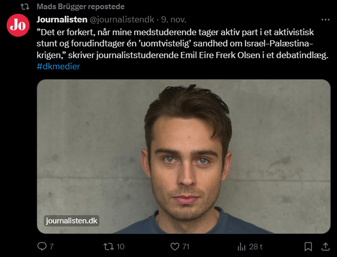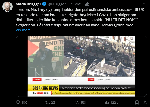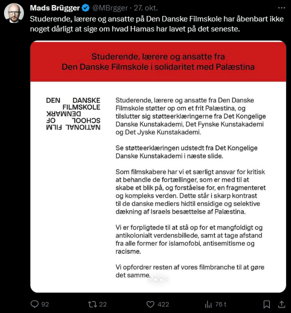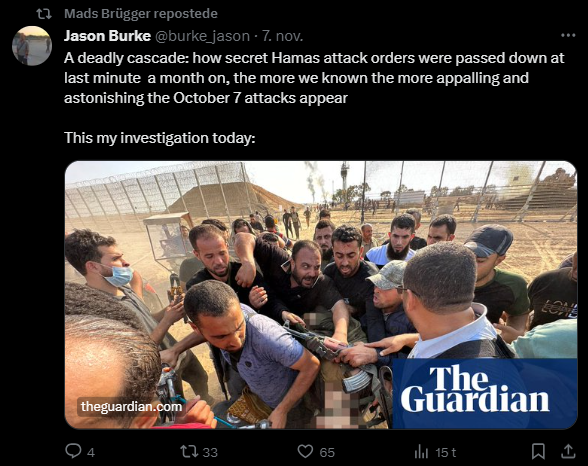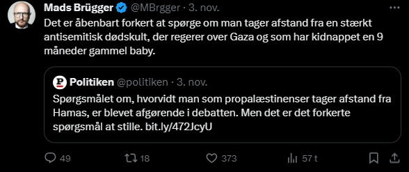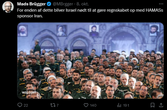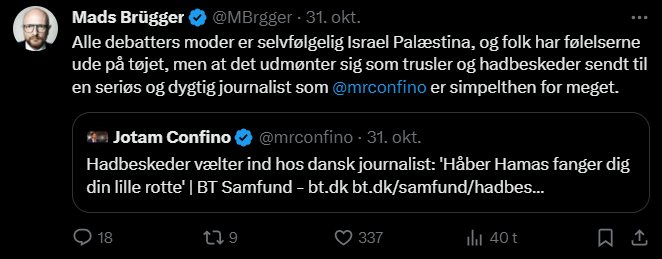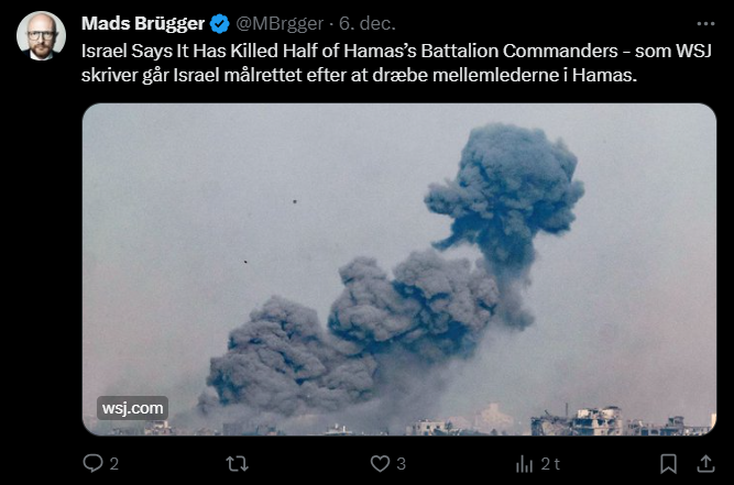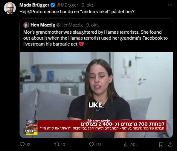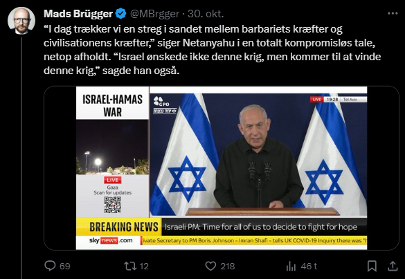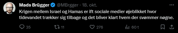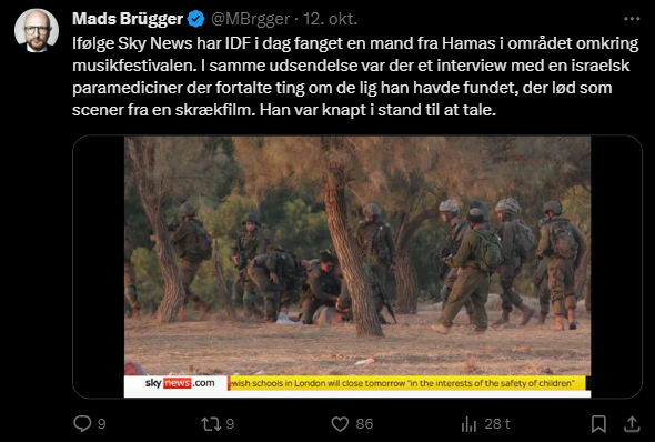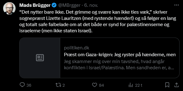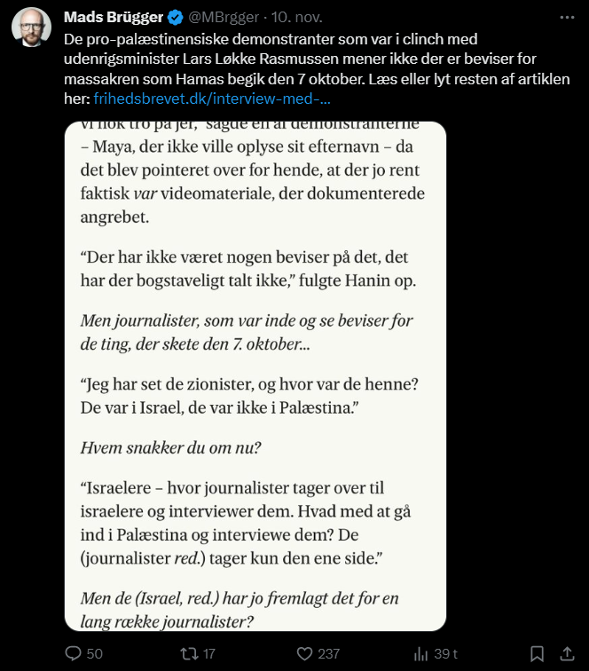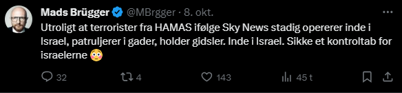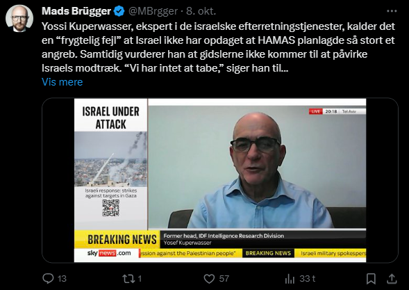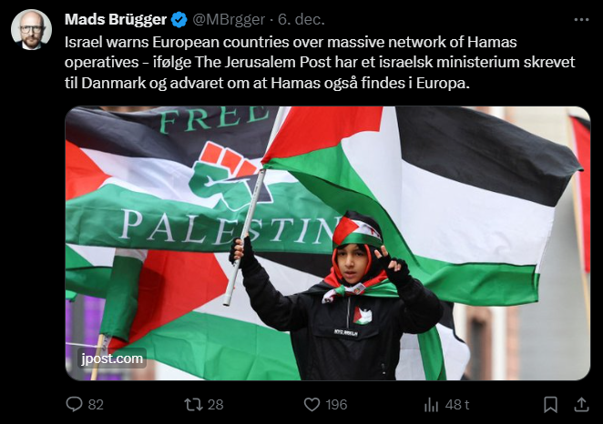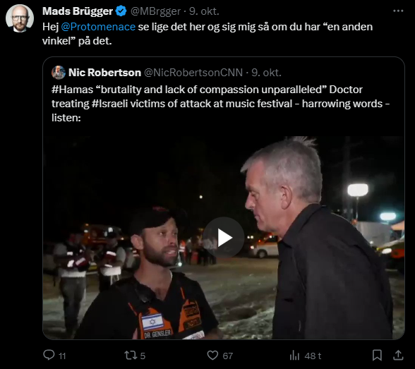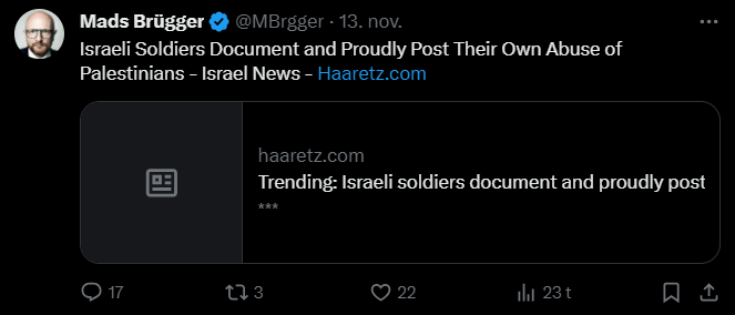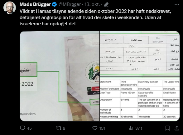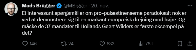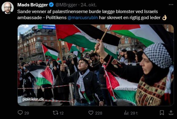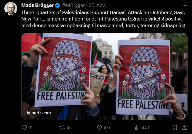 Mads Brügger er direktør, chefredaktør og journalist på Frihedsbrevet. For at få indblik i hvad han og Frihedsbrevet mener om Israel, har jeg lavet en analyse af 93 tweets af Mads Brügger på hans Twitter X-profil.