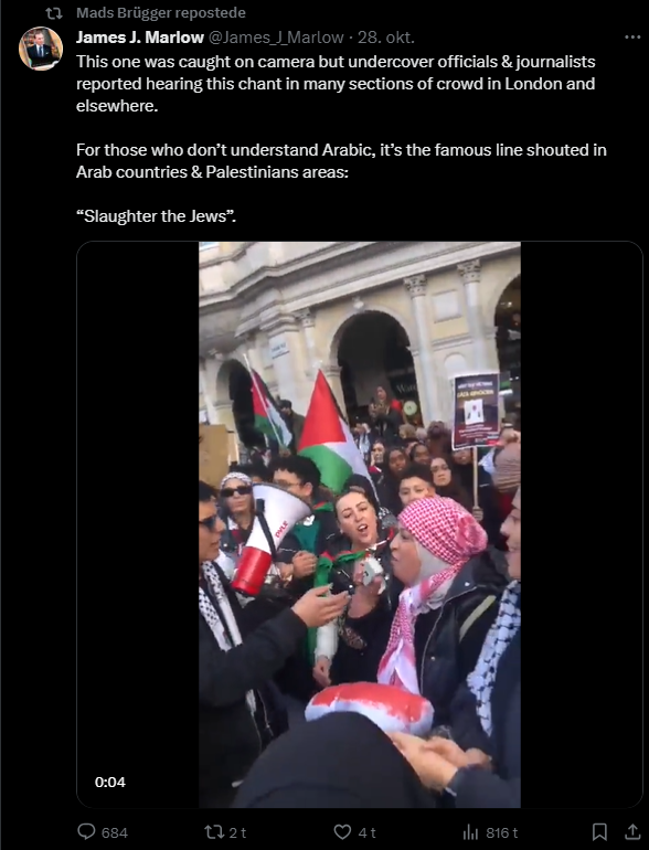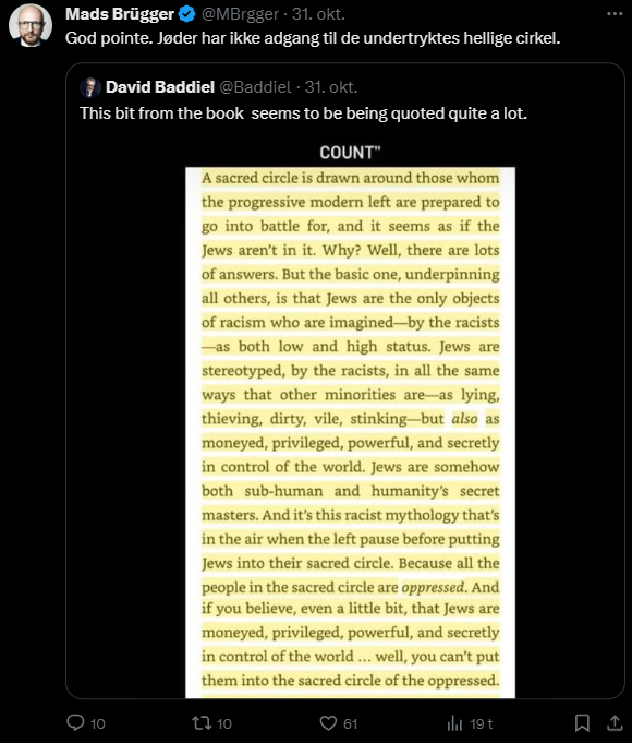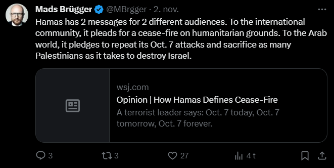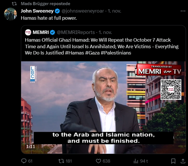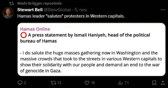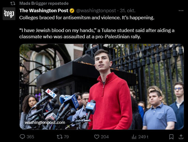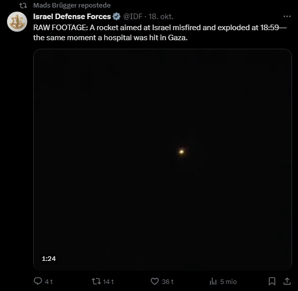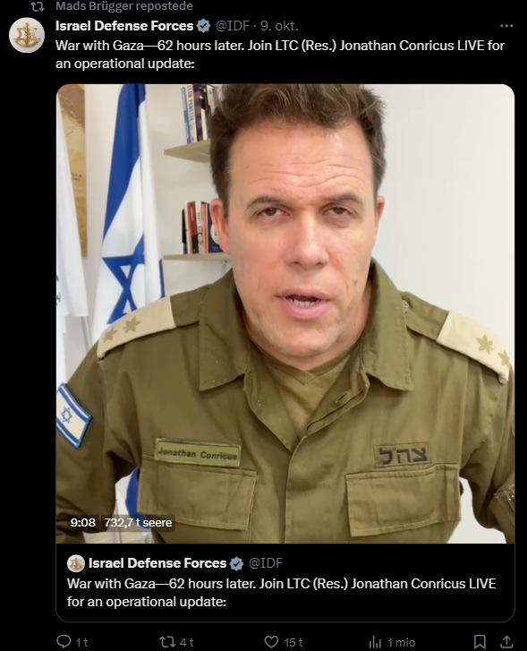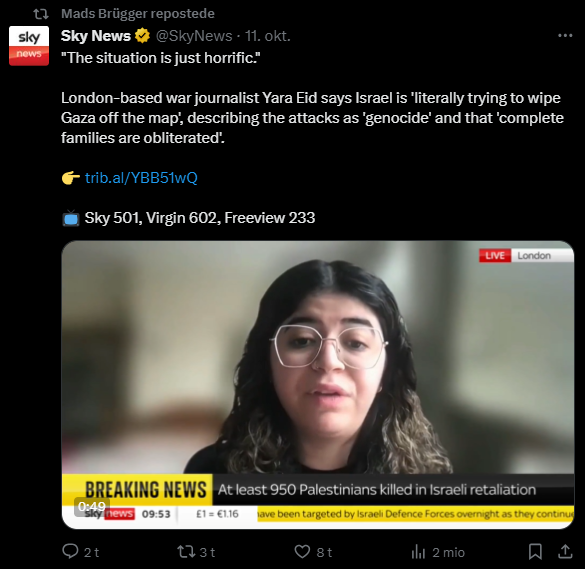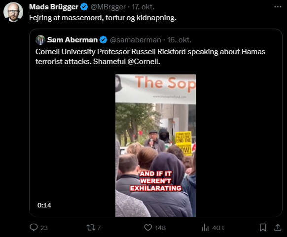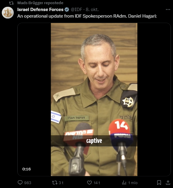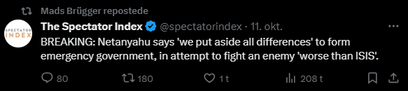 Jeg har gennemgået samtlige af hans tweets fra i dag tilbage til den 7. oktober og udvalgt dem, der udtrykker en holdning til Israel/Palæstina-konflikten eller zionisme inkl. jøder mere generelt. Jeg har givet hvert indlæg en zionistisk propagandascore (ZPS) på en skala fra -1 til +2.