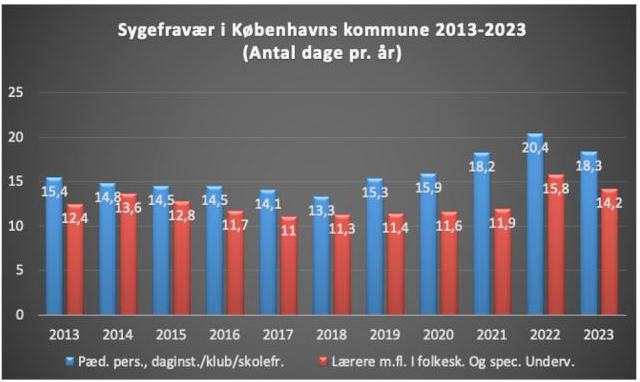Sidste år (2023) havde ’lærere med flere’ i Københavns kommune et gennemsnitligt sygefravær på 14,2 dage. Kommunens pædagogiske personale lå på 18,3 sygedage i snit. Året før var tallene endnu højere hhv. 15,8 og 20,4 dage. Det er nogle meget høje tal i min optik.