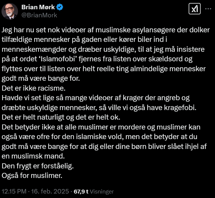 Komiker Brian Mørk skrev dette indlæg på X i går: