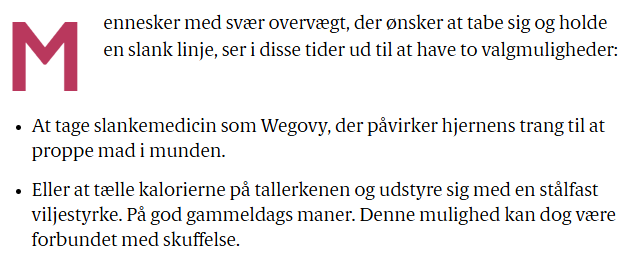 Videnskab.dk-artiklen er et godt eksempel på, hvordan det er gået ned ad bakke med folkeoplysningen om overvægt, siden Novo gik ind på overvægtsmarkedet. De eneste andre slankemetoder, der får omtale, er de, der er så uholdbare, at patienterne før eller siden bliver kunder hos Novo, om ikke for andet så fordi de falske alternativer virker så dårligt. Novo har sågar købt sig ind som sponsor af patientforeningen for overvægtige, så heller ikke der, kan man få lødig information.