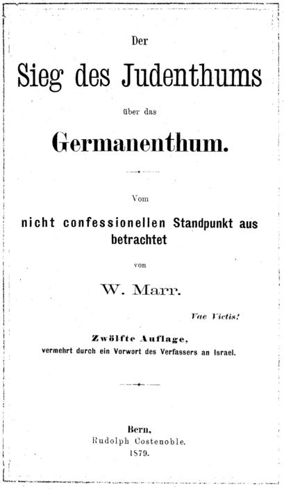 Det fremgår af Wilhelm Marrs levnedsbeskrivelse på Wikipedia, at hans racistiske had mod jøder ikke kan have været særligt dybtfølt. Han var gift fire gange, hvoraf de to var med jødiske kvinder: Helene Sophia Emma Maria Behrend og Jenny Therese Kornick. Han fik et barn, en søn, med en af de jødiske hustruer. Det betyder, at hans eget barn var jøde. Det kan også forklare, at han senere i sit liv angiveligt tog afstand fra antisemitisme.