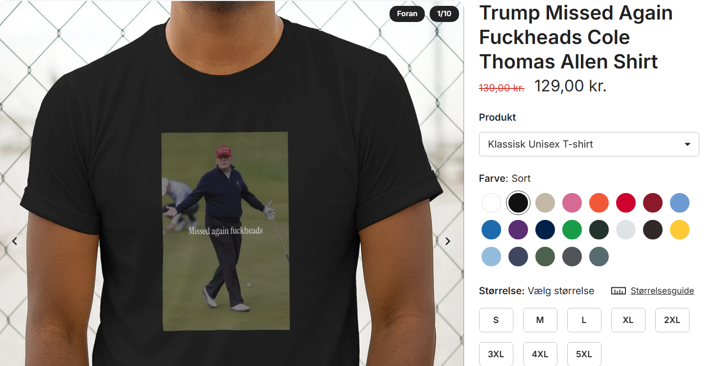 Du kan nu købe en ‘Trump Missed Again Fuckheads Cole Thomas Allen Shirt” helt op til ægte amerikanske størrelser på 2-5XL.