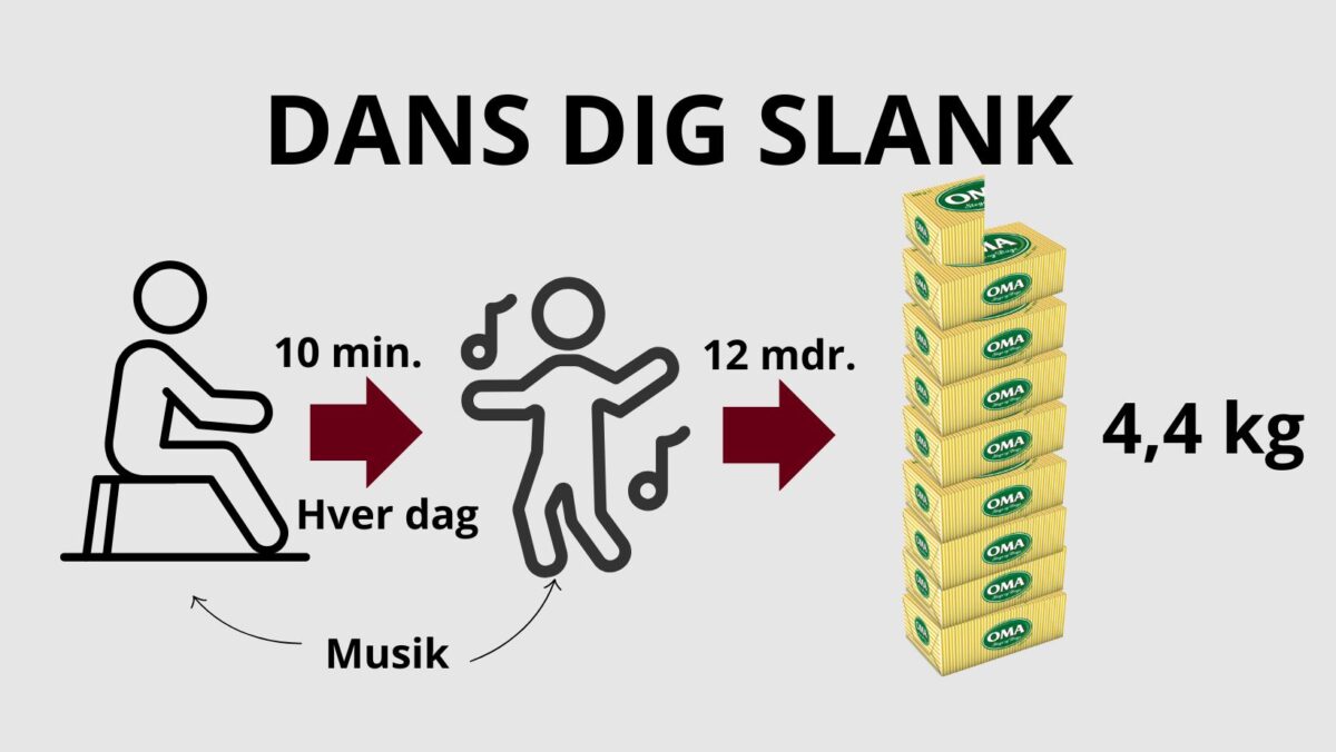 Hvis du plejer at sidde og lytte til musik i 10 minutter hver dag og begynder at danse rundt til musikken i stedet for, så vil du tabe 4,4 kg på 12 mdr.