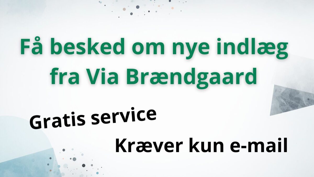 Få besked via e-mail om nye indlæg på Via Brændgaard. Bestem selv, hvilke emner du vil modtage nyheder om, og hvor ofte du vil modtage nyhedsmails.